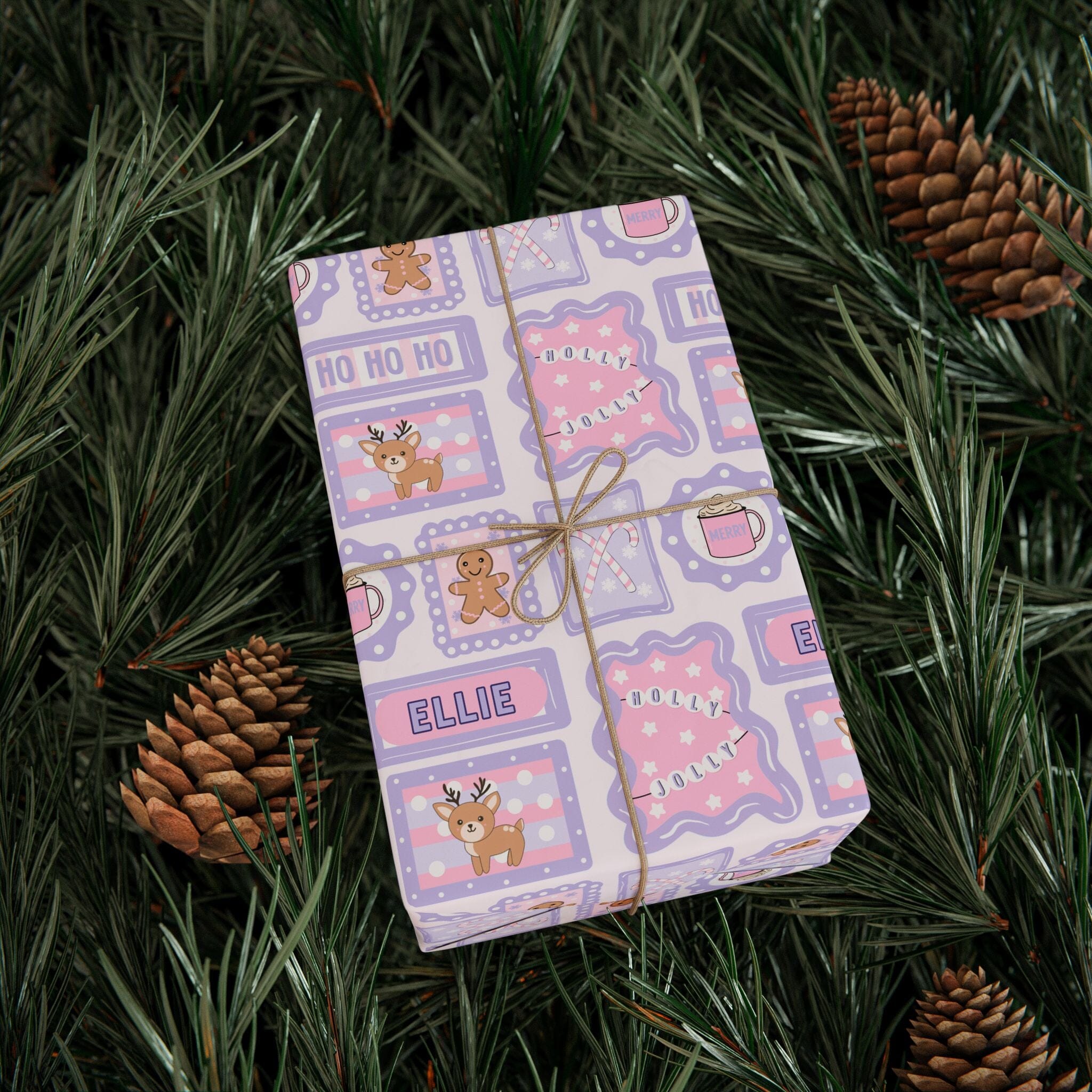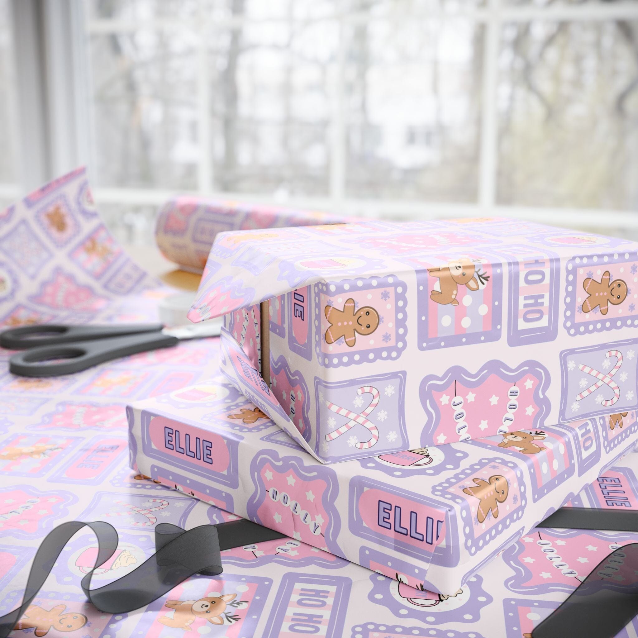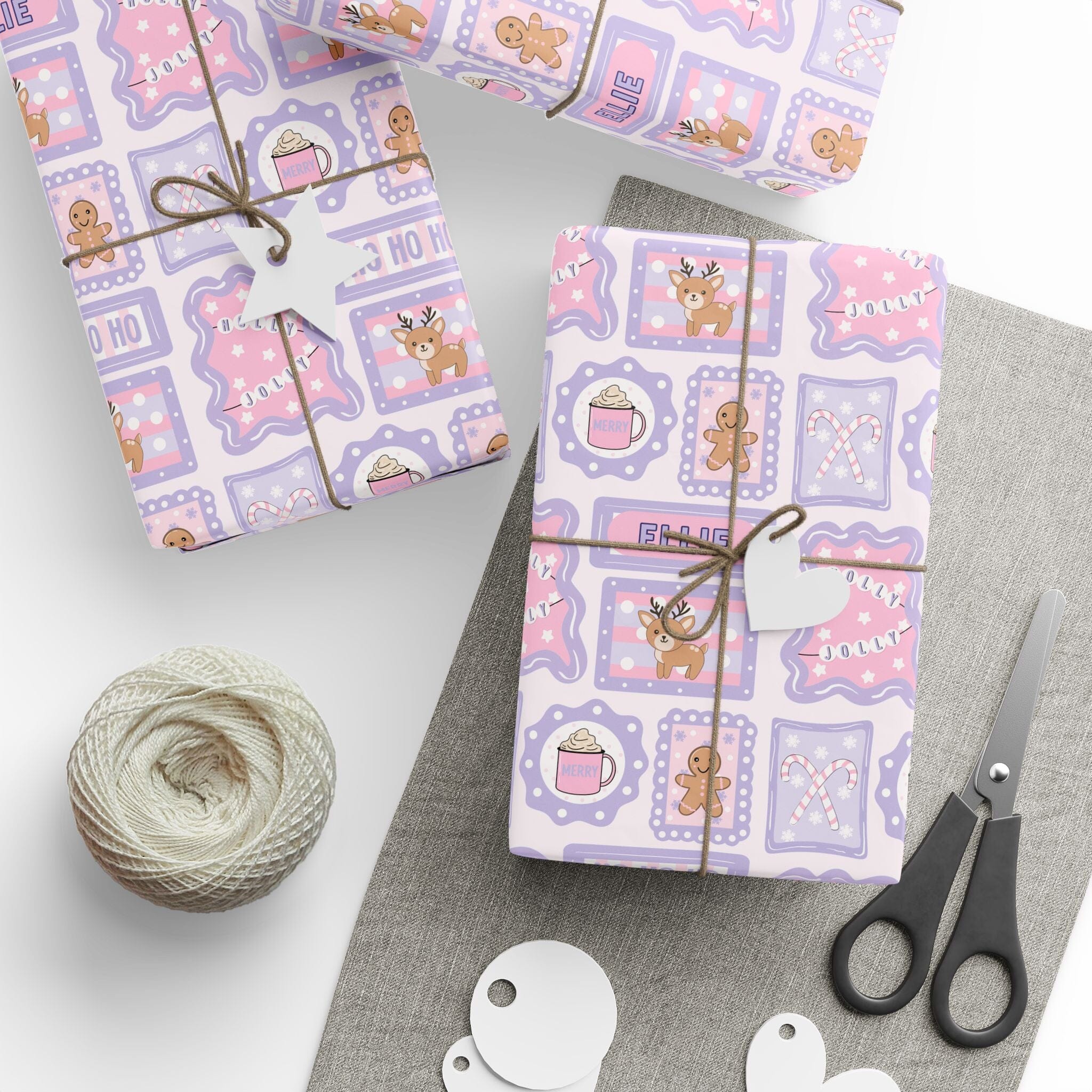 Personalized Purple and Pink Christmas Reindeer and Gingerbread Wrapping Paper- Christmas Gift Wrap, Custom Name Holiday Gift Wrap, Seasonal Wrapping Supplies